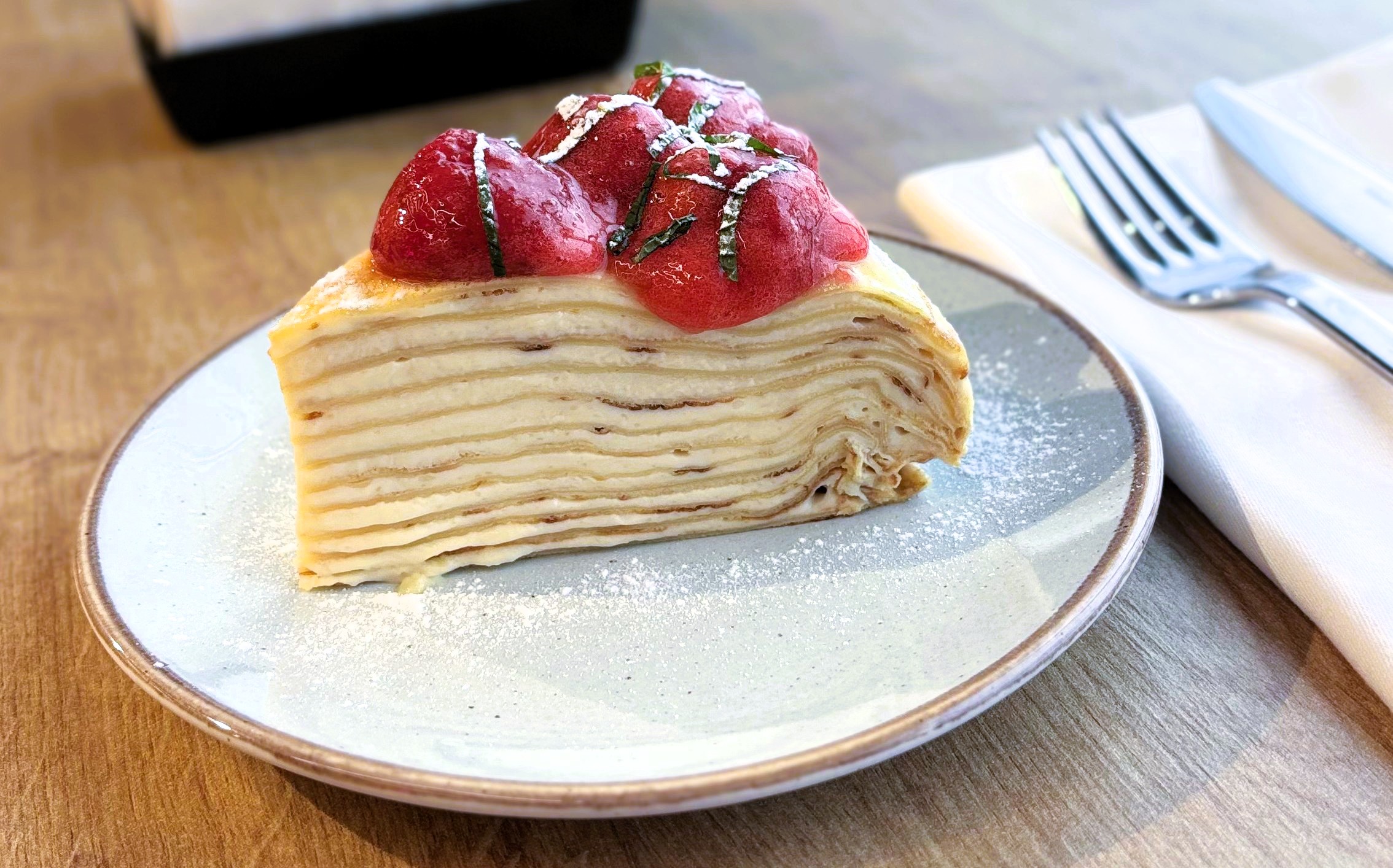 Готовый блинный торт достаём из морозилки, нарезаем на 8 аппетитных кусочков (порция 150 г). Украшаем клубникой, приготовленной по технологии Су-вид (70 г на порцию), добавляем свежую рубленую мяту (2 г) и легкую вуаль из сахарной пудры (2 г).