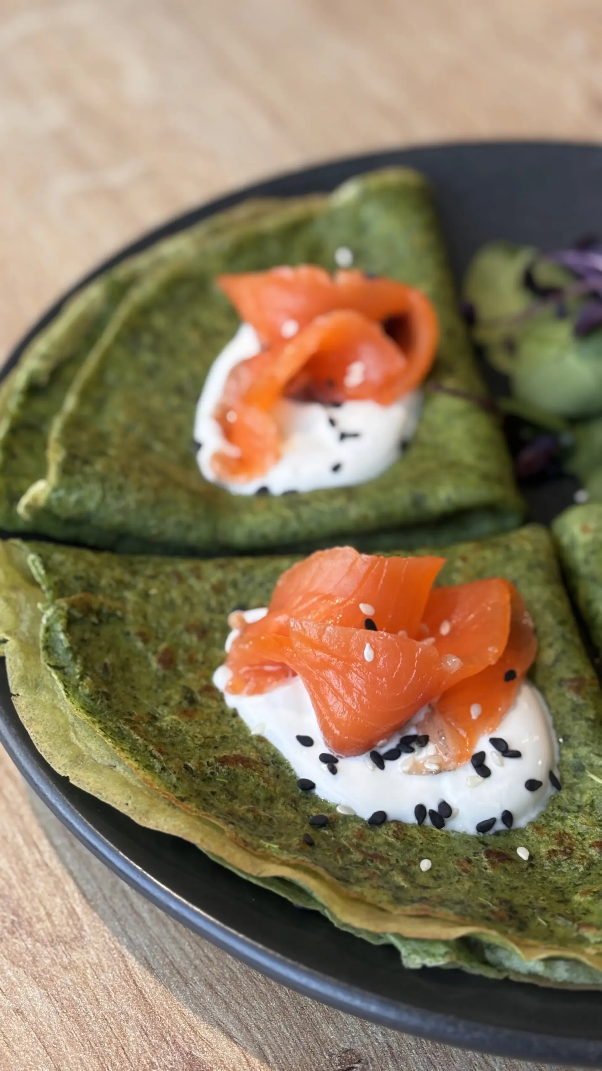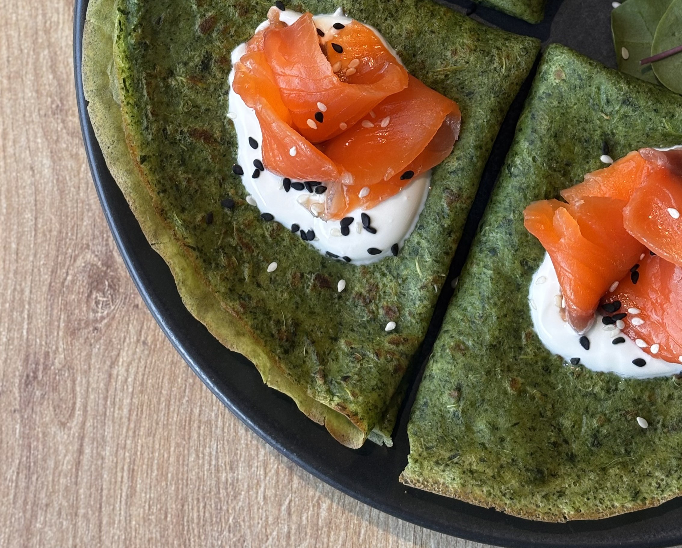 Представляем вам фирменное блюдо: Блинчики из шпината с подкопченной сметаной и лососем «Гравлакс».