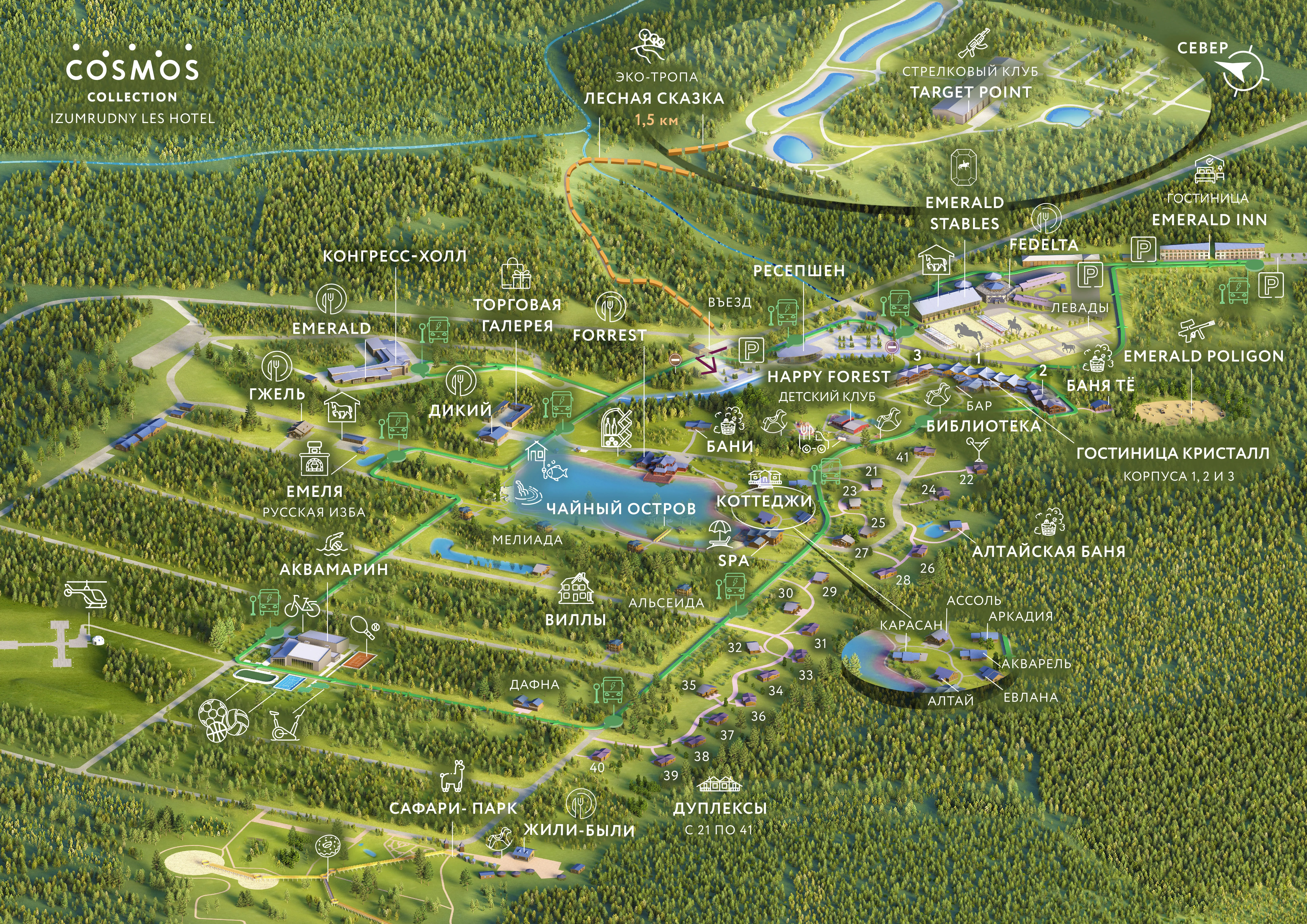 Сosmos Collection Izumrudny Les — современный пятизвездочный загородный отель, расположенный в лесной зоне Подмосковья. Комплекс занимает территорию площадью 220 гектаров и предлагает 137 номеров различных категорий: от уютных студий до роскошных вилл у озера.