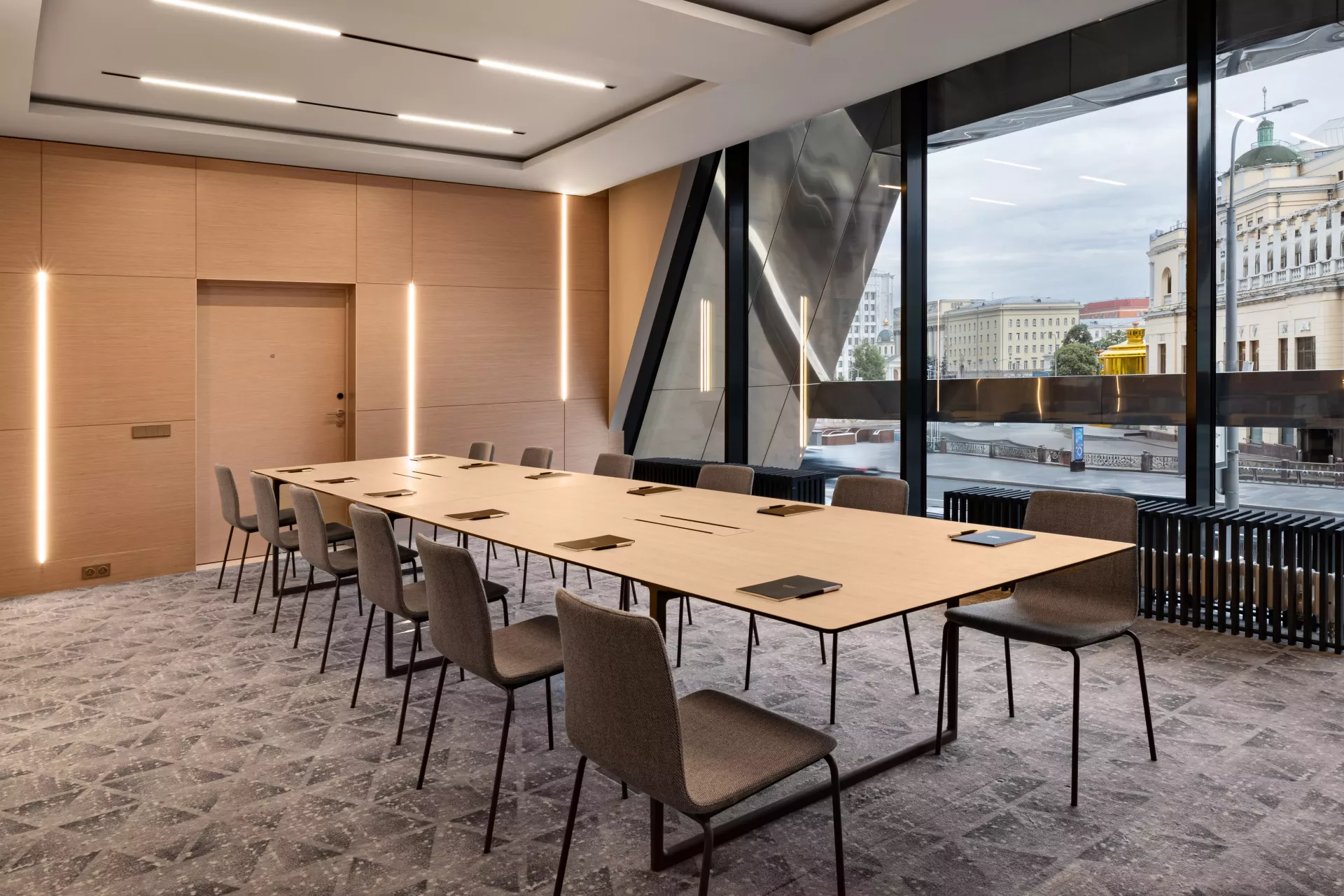 Просторная переговорная площадью 32 м² с эргономичной планировкой вмещает до 25 участников.