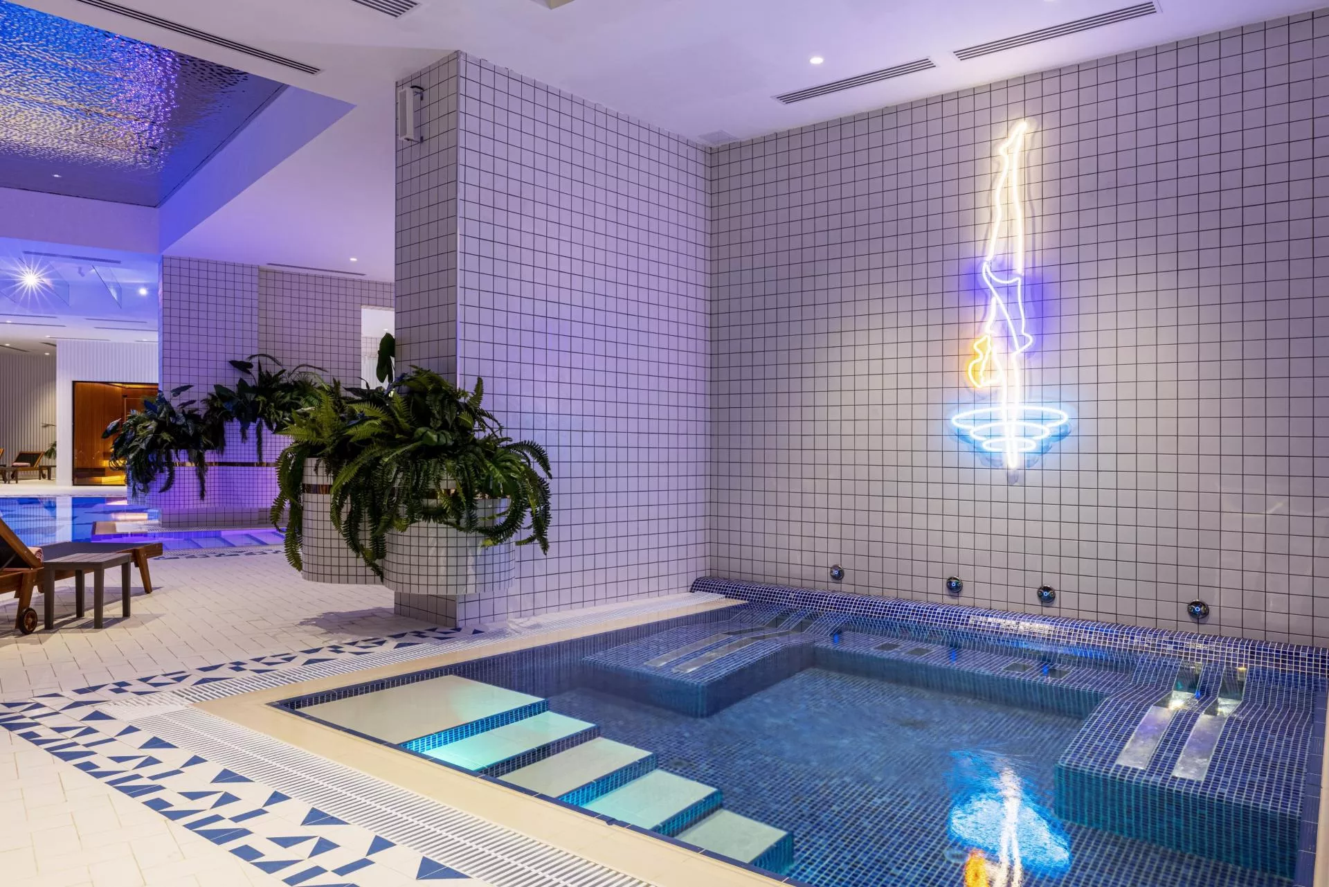 Плавательный бассейн предназначен для свободного оздоровительного плавания и проведения оздоровительных и релаксационных водных процедур. Бассейн оборудован прожекторами для подводного освещения, оснащен системами гидромассажа, водопадами